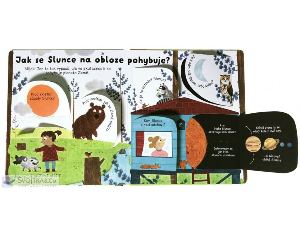 Každý den s ním vstává i chodí spát celý svět. Co je to? Přece naše Slunce! Víš, že Slunce je ve skutečnosti hvězda? Tak jak to, že nevypadá jako ostatní hvězdy na nebi? To proto, že je mnohem blíž, a tak se nám zdá veliké. Další odpovědi na všechny možné i nemožné otázky, které by tě o Slunci mohli napadnout, se dozvíš v této ilustrované knížce s odklápěcími okénky. Zjistíš, že nejen všichni živí tvorové na Zemi, ale i všechny květiny potřebují Slunce k životu. Dozvíš se, že Slunce může i za takové věci, jako je déšť nebo duha. Odhalíš, jak fungují sluneční hodiny a co je to vlastně stín. Slunce na tebe svítí každý den, posviť pro jednou i ty na něj!